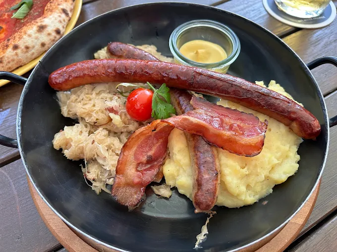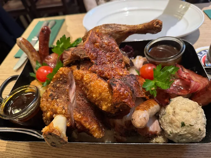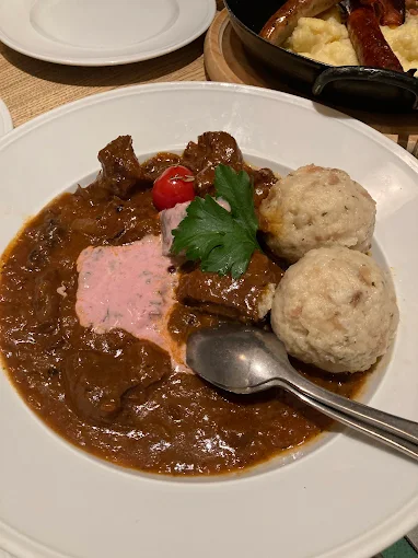 Service here is more than efficient; it’s warm, personal, and attentive, making every guest feel like a “Stammgast” (regular). Step into our ambience – a cozy blend of rustic wood panels, soft checkered tablecloths, and soft lighting that echoes an old-world Alpine tavern. Whether you’re celebrating or simply unwinding after exploring Munich, our food delivers pure comfort: think pretzels, Obatzda cheese spread, schnitzels