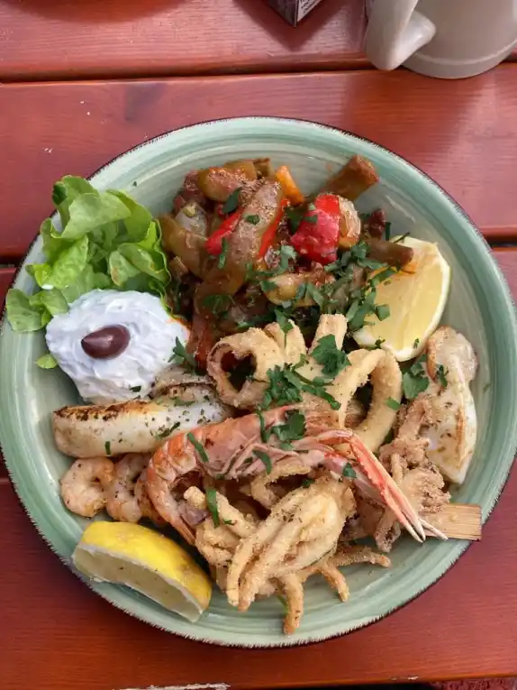 Fischteller Calamari, Baby-Calamari, Doradenfilet, Garnelenspieß Calamari, Baby-Calamari, Doradenfilet, Garnelenspieß