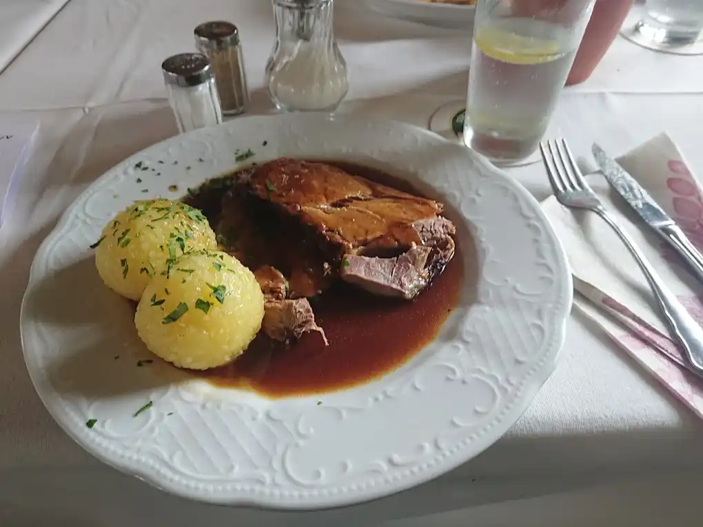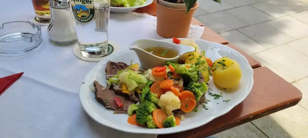 Our restaurant serves hearty Bavarian specialties crafted from fresh, regional ingredients. From our signature Schweinebraten to homemade dumplings and seasonal delights, every dish reflects our commitment to quality and taste. Enjoy your meal in one of our unique dining spaces: the cozy, traditional restaurant, the elegant, light-flooded winter garden, or our idyllic terrace under the shade of old chestnut trees.